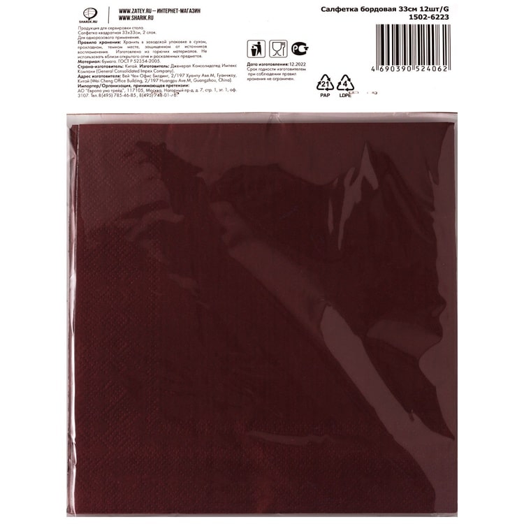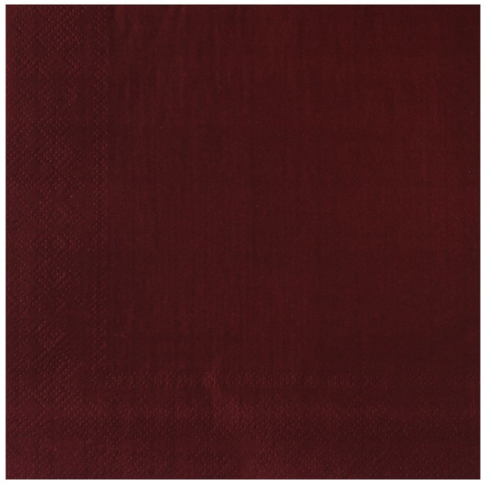 Бордовая двухслойная салфетка 33х33см, 12 штук в упаковке. Используется совместно с другими элементами коллекции (тарелки ,стаканы, скатерть) как украшение стола или по своему непосредственному назначению.